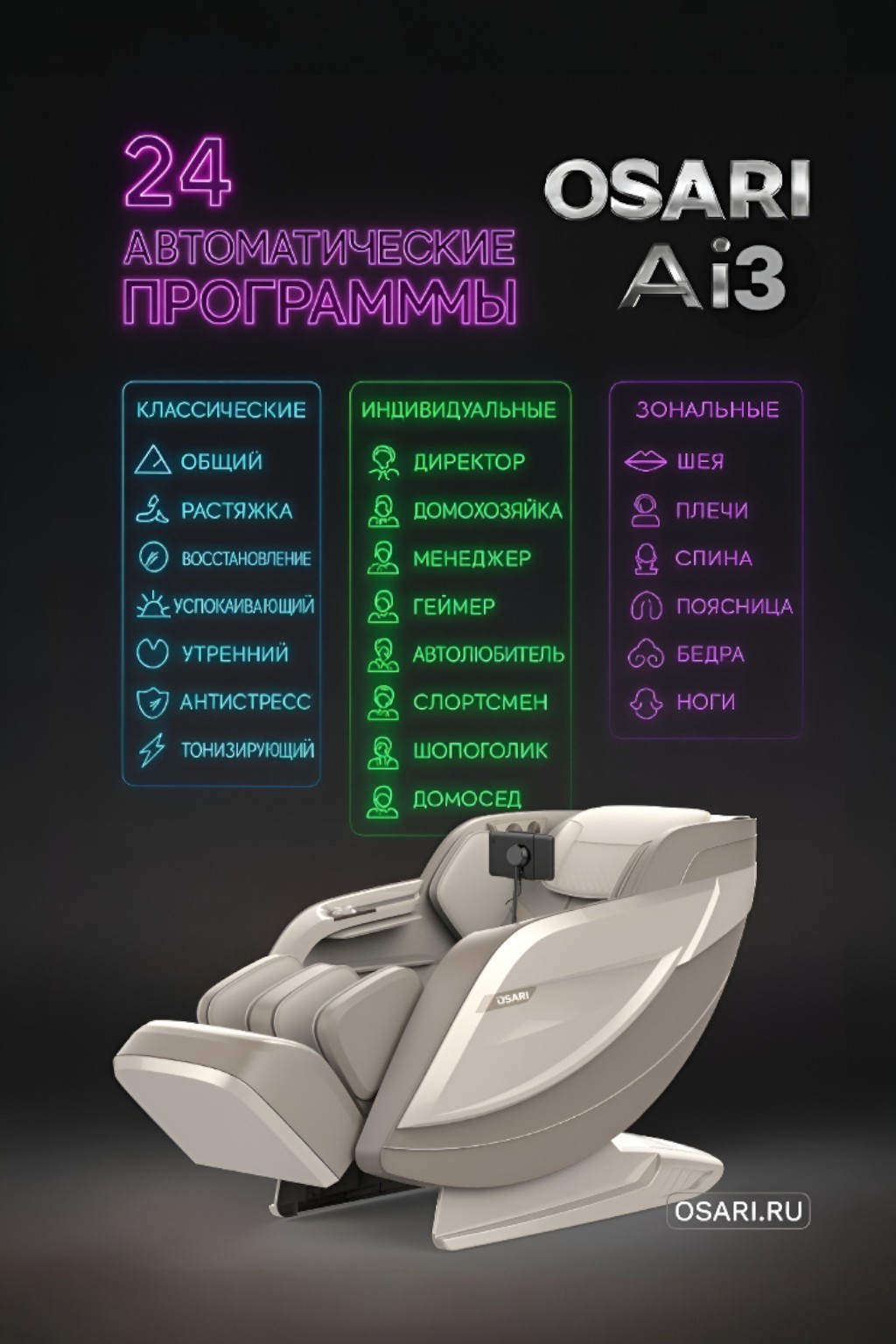 OSARI Ai3 - учитывает анатомические особенности каждого пользователя, оптимизирует интенсивность, глубину и траекторию массажа. Благодаря встроенным датчикам и алгоритмам Ai, массажное кресло выполняет мультиадаптивное массажное воздействие и не ограничивается базовыми техниками массажа и циклами. Массаж удивляет каждую минуту!